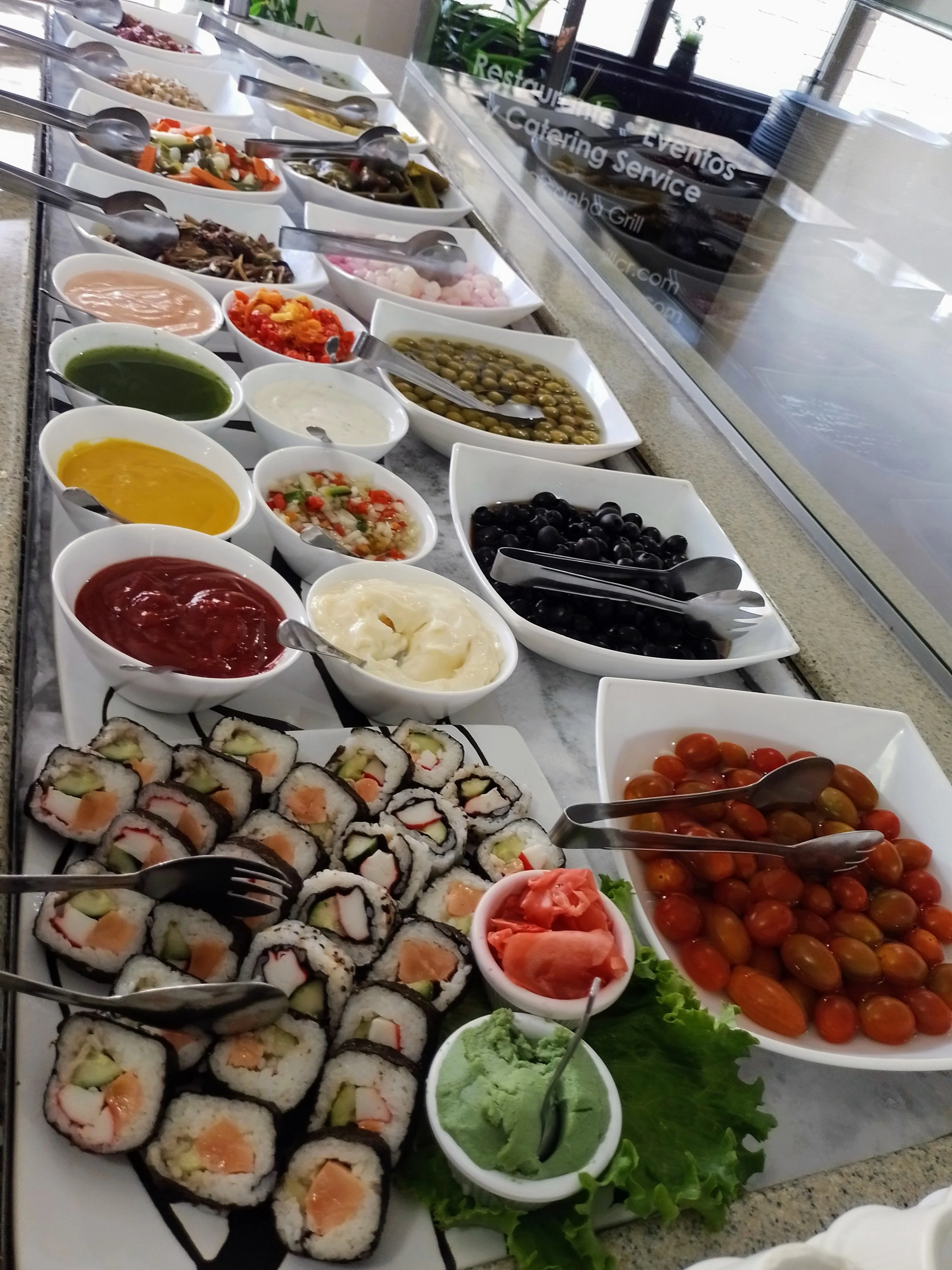 A parte, las guarniciones calientes y ensaladas se encuentran en una barra y los comensales pueden comer lo que gusten también.